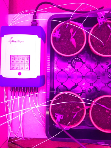 PhytlSigns est une technologie de biocapteur qui analyse et interprète les signaux électriques émis par les plantes. Les 8 canaux du capteur, reliés à des électrodes fixées à la tige de la plante, captent les signaux internes qui sont ensuite analysés.