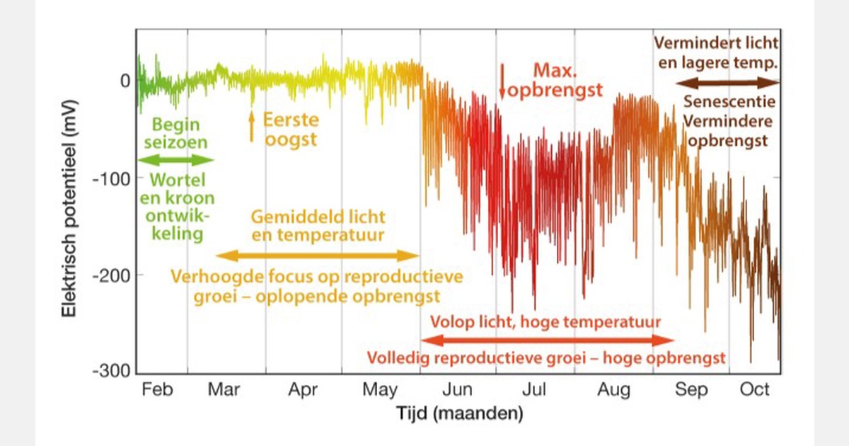 Les 3,5 premiers mois avec des pousses relativement stables reflètent le développement intensif des racines de la tomate (phase verte) et le développement de la cime (phase jaune) en préparation de la phase de propagation intensive en été. L’apparition soudaine d’une tendance en U et des amplitudes plus élevées des fluctuations journalières (phase rouge) de juin à août caractérisent la période de rendements les plus élevés et de forte vitalité des plantes. Une diminution des valeurs du potentiel électrique au cours des deux derniers mois (phase brune) indique une diminution de la vitalité de la plante en raison de températures plus basses et d’une disponibilité limitée de la lumière. Le graphique montre une moyenne des valeurs mesurées sur 8 systèmes différents.
